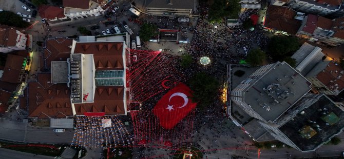 15 Temmuz gecesi umutlarımıza hayallerimize özgürlüğümüze geleceğimize pranga vurulmak istenmiş. Milletimizin vergileriyle alınan tanklarımız, uçaklarımız, helikopterlerimiz ve silahlarımız kahraman Türk ordusunun şerefli üniformasını hak etmeyen asker görünümlü hainler tarafından halkımıza çevrildi. Hamd olsun ki Cenab-ı Allah'ın lütfu, Cumhurbaşkanımızın cesareti ve üstün liderliği ile harekete geçen yüce milletimiz, tankın helikopterin ve tüfeğin karşısına sadece ve sadece imanı ve inancıyla yüreğiyle dikilmiştir. FETÖ terör örgütü tarafından gerçekleştirilmek istenen hain darbe ve ülkeyi bölme girişimi aziz milletimizin ölüme meydan okuyan kararlılığıyla engellenmiş, gecenin karanlığını aydınlığa çevirmiştir. O karanlık gecede millet olarak verdiğimiz mücadele ezelden beri hür yaşayan bu aziz milletin darbelere boyun eğmeyeceğinin en net ifadesidir" diye konuştu.