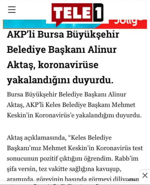 Keles Belediye Başkanı Mehmet Keskin'in Koronavirüse yakalandığı haberinin başlığını "Bursa Büyükşehir Belediye Başkanı Alinur Aktaş Koronavirüse yakalandı" diye servis eden Tele1'e sosyal medya üzerinden cevap veren Aktaş, "Zekâ kokan bu haber için Tele1 TV kadrosunu alkışlıyorum!!! " ifadelerini kullandı.