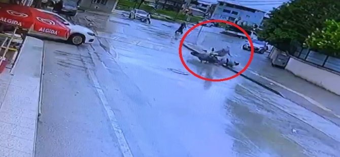 Tam bu esnada seyir halindeki motosiklet sürücüsü sonradan fark ettiği anne ve çocuğuna çarpmamak için frene bastı. Yağışlı havanın etkisiyle yan yatar motosiklet kayarak küçük çocuğa ve yanında bulunan annesine çarptı.