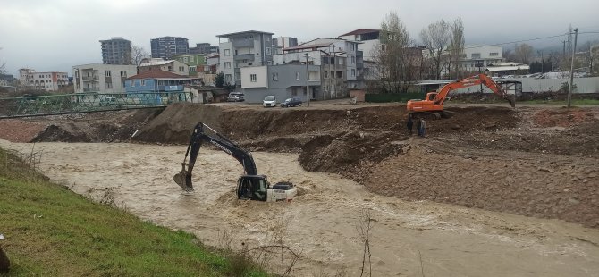 Deli Çay deresinde ıslah çalışması yapan kepçe operatörü ise, yağışların dinmesiyle çalışmalarını sürdürmek istedi. Ancak yağışlarla birlikte ıslanan toprağı hesaba katamadı.