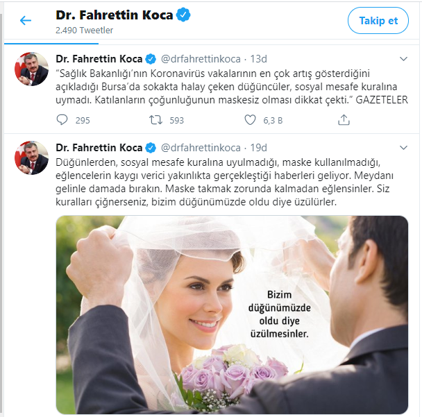 Daha önce bir çok kez koronavirüs önlemleri konusunda Bursa'yı uyaran Sağlık Bakanı Fahrettin Koca, Twitter'dan yine Bursa paylaşımında bulundu. Koca, Bursa örneği vererek, sosyal mesafe kuralına uymayan düğüncüleri uyardı.