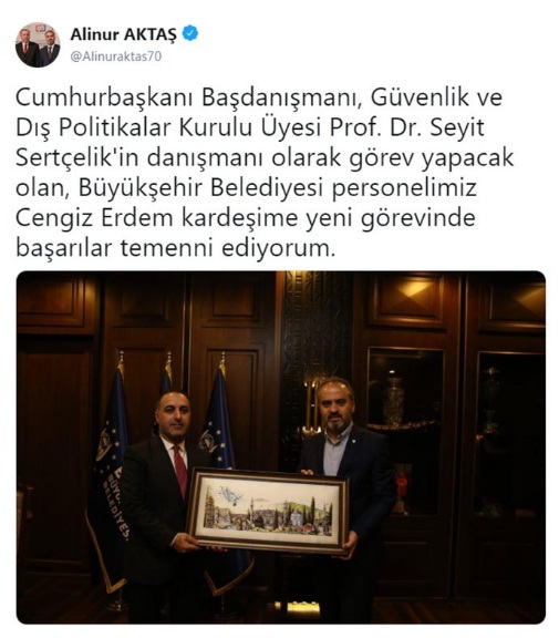 Cumhurbaşkanı Başdanışmanı’na danışman atanmasını, Bursa Büyükşehir Belediye Başkanı AKP'li Alinur Aktaş twitter hesabından duyurdu. Aktaş, yaptığı paylaşımda “Cumhurbaşkanı Başdanışmanı, Güvenlik ve Dış Politikalar Kurulu Üyesi Prof. Dr. Seyit Sertçelik’in danışmanı olarak görev yapacak olan, Büyükşehir Belediyesi personelimiz Cengiz Erdem kardeşime yeni görevinde başarılar temenni ediyorum.” dedi.