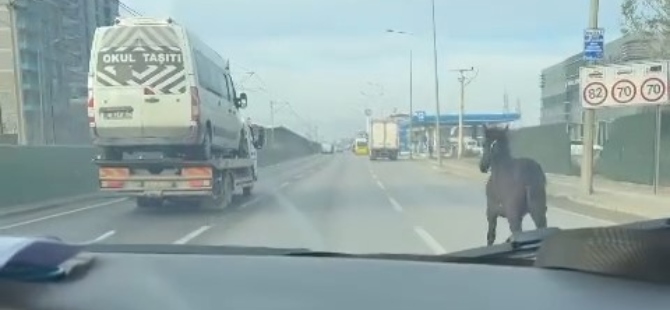Ana caddede araçların arasında koşturan tayı, bir araç yan yola yönlendirmeye çalışsa da başarılı olamadı.