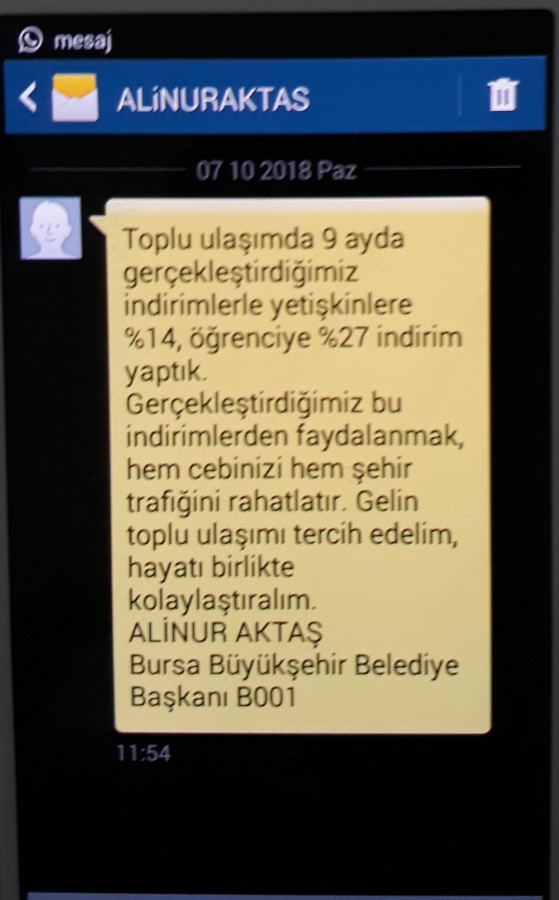 Bursa Büyükşehir Belediye Başkanı Alinur Aktaş, cep telefonlarına SMS göndererek, şehir içi ulaşımda toplu taşıma araçlarının tercih edilmesini istedi.