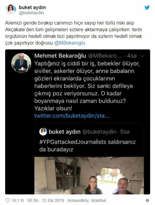 "Ailemizi geride bırakıp canımızı hiçe sayıp her türlü riski alıp Akçakale’den tüm gelişmeleri sizlere aktarmaya çalışırken terör örgütünün hedefi olmak bizi şaşırtmıyor da sizlerin hedefi olmak çok şaşırtıyor doğrusu."