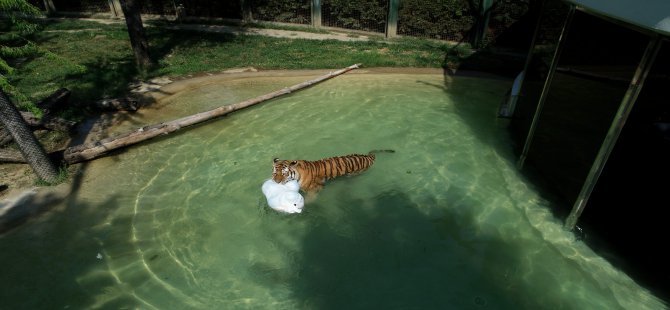 Bursa Hayvanat Bahçesi’ndeki Amur kaplanı Victor’un çuvalın içindeki yemeğini havuzda parçalaması havadan da görüntülendi.