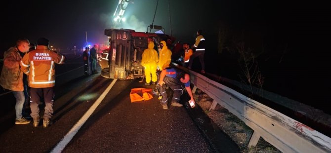 Bursa'nın İnegöl ilçesinde kontrolden çıkan asit taşıyan tanker devrildi, kazada sürücü hayatını kaybetti. Öte yandan tırdan dökülen asit dereye karışırken, AFAD ekipleri gaz ölçümü yaptı.