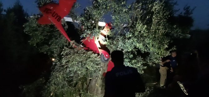 Yaşanan arıza nedeniyle pilot Erkan Hoç yanındaki yolcu Gökhan Molla ile hava taşıtını zeytin ağaçlarının üzerine indirmek için harekete geçti.