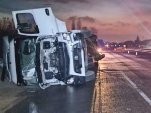 Uşak ilinden Bursa'ya seyir halinde olan Şerif Ali U. İdaresindeki 64 AF 800 plakalı iplik yüklü tır, sürücüsünün kontrolünden çıkarak devrildi.