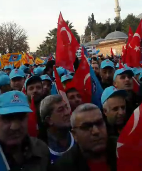 Bursa'da Renault, Ford, TOFAŞ, Bosch ve yedek sanayi fabrikalarında çalışan işçiler, iş yerlerindeki vardiya giriş çıkışlarında yaptıkları eylemi, Kent Meydanı'na taşıdılar.