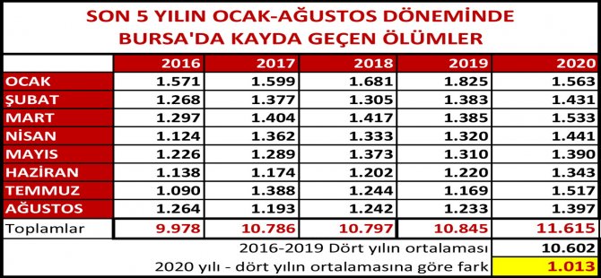 Karaca, Bursa’da son 5 yılın ocak-ağustos dönemi vefat sayıları incelendiğinde, 2016’da 9.978, 2017’de 10.786, 2018’de 10.797, 2019’da 10.845 kişinin öldüğünü, bu rakamın ocak-ağustos 2020’de 11.615 olduğunu kaydetti. 2020 rakamlarındaki yükselişe işaret eden Karaca sözlerini şöyle sürdürdü: