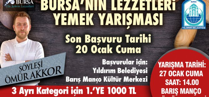 Yıldırım Belediyesi tarafından düzenlenen ‘Bursa’nın Lezzetleri Yemek Yarışması’nda en iyi cevizli lokum, en iyi cantık ve en iyi tahinli pide seçilecek. Bursa’nın meşhur tatlarının yaşatılması adına düzenlenen yarışmaya başvurular Yıldırım Belediyesi hizmet binası ve Barış Manço Kültür Merkezi’nde 20 Ocak 2017 tarihine kadar devam edecek.
