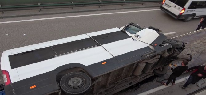 Bursa’da direksiyon hâkimiyetinin kaybedilmesiyle önce bariyerlere ardından öndeki minibüse çarpan minibüs devrildi. Devrilen minibüsün sürücüsü yaralandı.