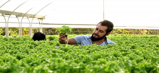 Bursa'da bir müteşebbis, kurduğu serada toprak kullanmadan suyun içinde marul yetiştiriyor.