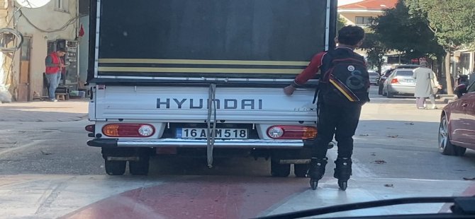 Bursa'nın İnegöl ilçesinde bir kamyonetin arkasına tutunarak ilerleyen patenli öğrencinin trafikteki tehlikeli oyunu kameralara yansıdı.