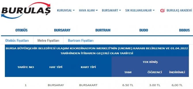 Metro, tam bilet fiyatı 5,25 liradan 6,50 liraya yükselirken, indirimli 4,50 liradan 6 liraya, öğrenci ise 2,25 liradan 3 liraya yükseldi. Otobüs kısa hat 5,50 liradan 6,50 liraya yükselirken, indirimli 6 liraya, öğrenci 3 liraya yükseldi.