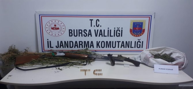 İnegöl Jandarma Komutanlığı ve JASAT ile İstihbarat şube müdürlüğü ve KOM şube müdürlüğü ekiplerinin ortak çalışmaları sonucu M.S. isimli kişinin Tuzla Mahallesinde bulunan evinde ve müştemilatında yapılan aramalar sonucu yüklü miktarda Kubar esrar, 2 adet ruhsatsız av tüfeği, 27 adet 7.65 mm çapında fişek ele geçirildi.
