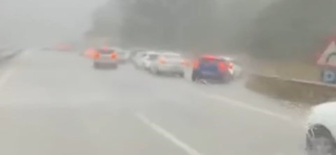 Bursa Yalova yolu üzerinde yağan yağmur sebebiyle göz gözü görmezken, araçlar yol kenarına çekip yağmurun dinmesini bekledi.
