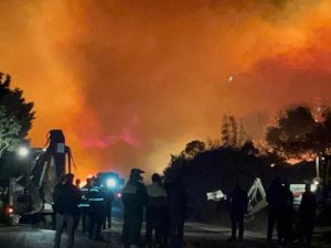 Çok sayıda kara ekibi yangına müdahale ederken, şiddetli rüzgar söndürme çalışmalarını güçleştirdi.