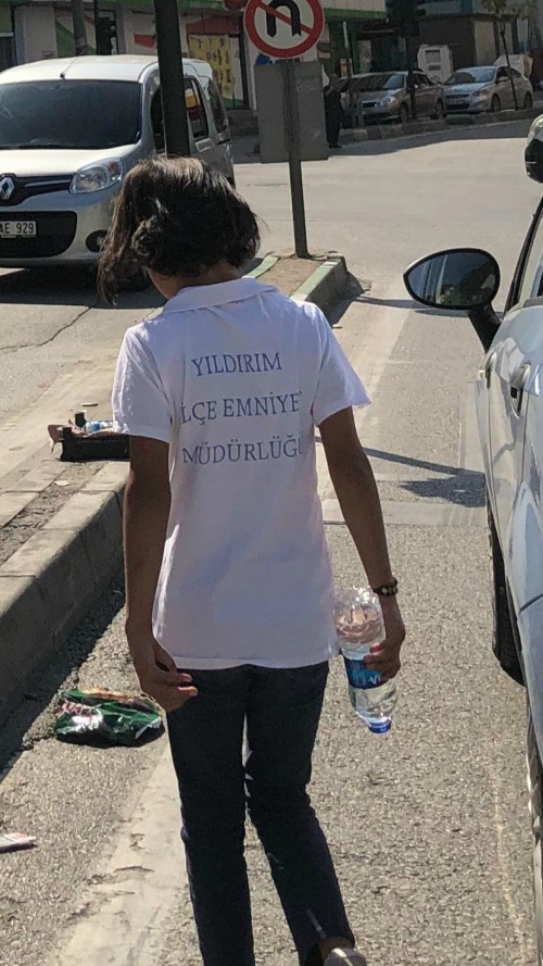 Bursa’nın Yıldırım ilçesinde lambalarda üzerinde ilçe emniyet müdürlüğü tarafından bastırılan tişörtle su satarken fark edilen 11 yaşındaki kıza emniyet sahip çıktı.