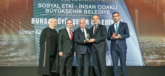 Bursa Büyükşehir Belediyesi de üreten kadın dernek ve kooperatiflerine yönelik yaptığı desteklerle İnsan Odaklı Sosyal Etki Kategorisinde ödüle değer görüldü. Ödül törenine katılan Bursa Büyükşehir Belediye Başkanı Alinur Aktaş, ödülü yarışmanın jüri üyesi Prof. Dr. Barbaros Gönençgil’in elinden aldı.