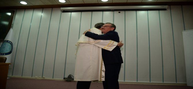 Önceki Rektör Prof. Dr. Ahmet Saim Kılavuz’a hizmetleri için teşekkür eden Prof. Dr. Ferudun Yılmaz; “Hocamızla verimli bir 4 yıl geçirdik. Kendisinin tecrübelerinden faydalandık. İdarecilik anlamında da çok şey öğrendik. İnşallah bundan sonra hocamızın bıraktığı çıtayı daha da yukarılara çıkarmak için elden gelen gayreti göstereceğiz” dedi. Konuşmaların ardından Prof. Dr. Ahmet Saim Kılavuz, yeni rektör Prof. Dr. Ferudun Yılmaz’a cübbesini giydirdi ve çiçek takdimi gerçekleştirdi. Ardından da salon çıkışında tebrikler kabul edildi.