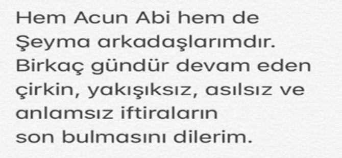 "Hem Acun Abi hem de Şeyma arkadaşımdır. Birkaç gündür devam eden çirkin,yakışıksız,asılsız iftiraların son bulmasını dilerim."