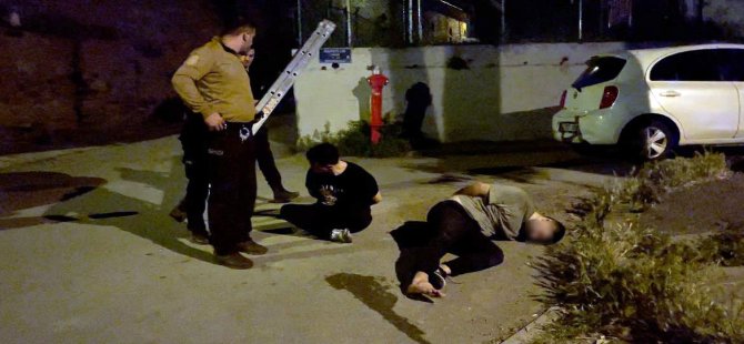 Gece bekçilerinden kaçmaya çalışan şüphelilerden biri metrelerce yükseklikten aşağı atlayınca ayağını kırarken, arkadaşı korkudan teslim oldu.