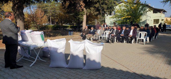 Orhaneli'de toplam 20 çiftçiye yüzde 75 devlet hibe destekli dekar başına 25 kilogram buğday tohumu verildi.