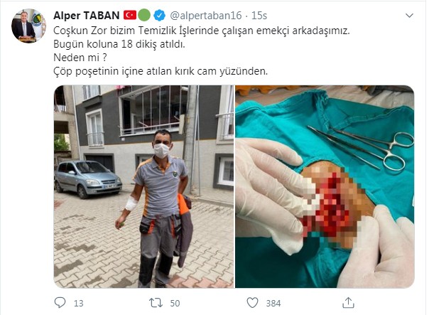 Edinilen bilgiye göre, İnegöl Belediyesi Temiz İşleri Müdürlüğü'nde Coşkun Zor isminde görevli bir kişi çöpün içine atılan cam kırıklarından dolayı kolundan yaralandı. İşçinin koluna 18 dikiş atıldı. Konuyla ilgili sosyal medya hesabında paylaşımda bulunan İnegöl Belediye Başkanı Alper Taban, "Coşkun Zor, bizim temizlik işlerinde çalışan emekçi arkadaşımız. Bugün koluna 18 dikiş atıldı. Neden mi? Çöp poşetinin içine atılan kırık cam yüzünden" dedi.