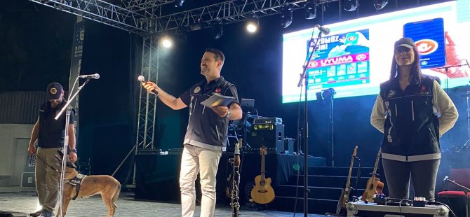 Konser öncesi sahneye çıkan Narkotik polisleri, 5 binin üzerindeki gence uyuşturucunun zararlarından bahsedip "Uyuma" Gençliğine Sahip Çık dedi.
