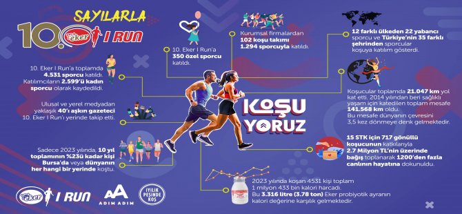 Eker Süt Ürünleri tarafından gerçekleştirilen Eker I Run Koşusu, her geçen yıl katılımcı sayısını artırarak büyümeye devam ediyor. "Koşuyoruz" mottosuyla 1 Ekim 2023 tarihinde Bursa'da düzenlenen 10. Eker I Run, rekor sayıda katılımcıyla gerçekleşti.