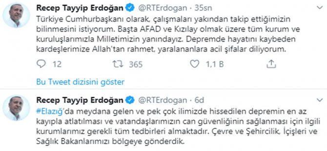 Elazığ'da meydana gelen 6.8 büyüklüğündeki depremin ardından açıklama yapan Erdoğan, Cumhurbaşkanı olarak çalışmaları yakından takip ettiğini belirtti. Erdoğan, "Depremde hayatını kaybeden kardeşlerimize Allah'tan rahmet, yaralananlara acil şifalar diliyorum" ifadelerini kullandı.