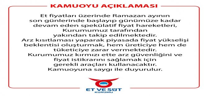 Et ve Süt Kurumu’nun sosyal medya hesabından yapılan paylaşımda, “Et fiyatları üzerinde Ramazan ayının son günlerinde başlayıp günümüze kadar devam eden spekülatif fiyat hareketleri kurumumuz tarafından yakından takip edilmektedir. Arz kısıtlaması yaparak piyasada fiyat yükselişi beklentisini oluşturmak, hem üreticiye hem de tüketiciye zarar vermektedir. Kurumumuz kırmızı ette arz güvenliğini ve fiyat istikrarını sağlamak için gerekli araçları kullanacaktır” ifadelerine yer verildi.