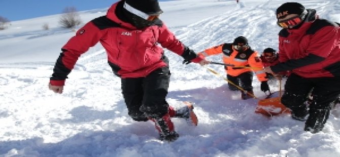 Zamana karşı yarışın yapıldığı tatbikatta, tamamen kara gömülen bir kayakçı, dakikalar içerisinde bulunup kurtarıldı. O ânlar saniye saniye görüntülendi.