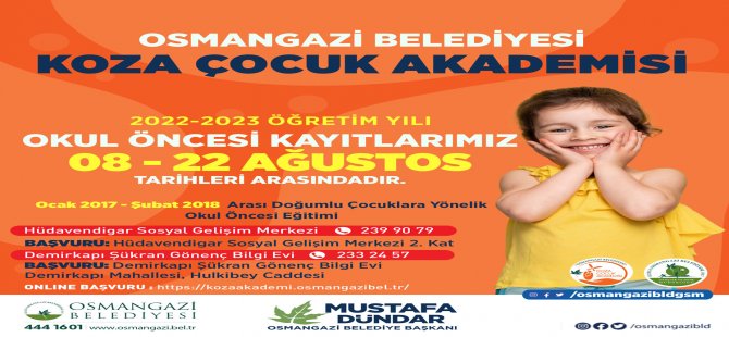 Sosyal hayatın gelişimine katkı sağlayarak kültürel faaliyet alanları oluşturan Koza Çocuk Akademi’nin yeni dönem kayıtlarının başladığını duyuran Osmangazi Belediye Başkanı Mustafa Dündar, “Koza Çocuk Akademi ile bu dönem Ocak 2017 ve Şubat 2018 arası doğumlu öğrencilerimize okul öncesi eğitimi vereceğiz. Uzman eğitmenlerimiz eşliğinde çocuklarımızı sevgiyle yarınlara hazırlayacağız. Vaktini değerli geçirmek isteyen tüm evlatlarımız, 22 Ağustos tarihine kadar https://kozaakademi.osmangazi.bel.tr/ adresinden kayıt yaptırabilir” dedi.