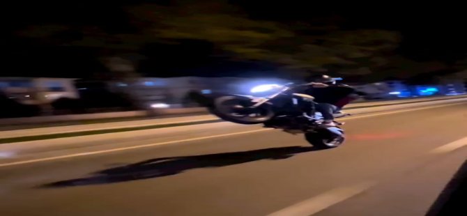 Bursa'nın İnegöl ilçesinde bir motosiklet sürücüsü, trafikte tek teker üzerinde metrelerce ilerledi. Motorcunun tehlikeli yolculuğu başka sürücü tarafından cep telefonu kamerası ile görüntülendi.