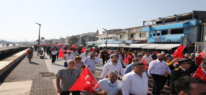 Mudanya Kaymakamı Ayhan Terzi, Mudanya Belediye Başkanı Hayri Türkyılmaz, ilçe protokolü, meclis üyeleri ve Mudanyalılar, İskele Meydanı’ndan Mütareke Meydanı’na yürüyüş gerçekleştirdi.