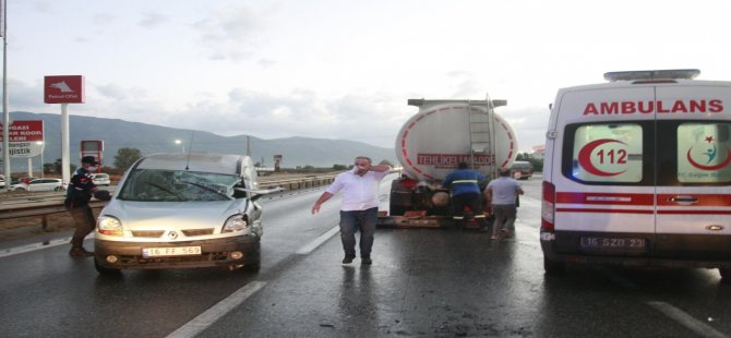 Trafikte Ramazan Ö. (44) idaresindeki 16 AFY 969 plakalı akaryakıt yüklü tanker aniden durunca aynı yönde gitmekte olan Abdullah T. (78) idaresindeki 16 FF 569 plakalı hafif ticari araç tankere çarptı. Kaza sonrasında hafif ticari araç sürücüsü Abdullah T. yaralandı. Araç içinde sıkışan yaşlı adamı sıkıştığı yerden vatandaşlar ve polis ekipleri çıkararak olay yerine gelen ambulansa taşıdı. Orhangazi Fenerbahçeliler Derneği yöneticilerinden Hasan T.’nin babası olduğu belirlenen Abdullah T., ambulansla Orhangazi Devlet Hastanesine kaldırılarak burada tedavi altına alındı. Polis ekipleri kazayla ilgili soruşturma başlattı.