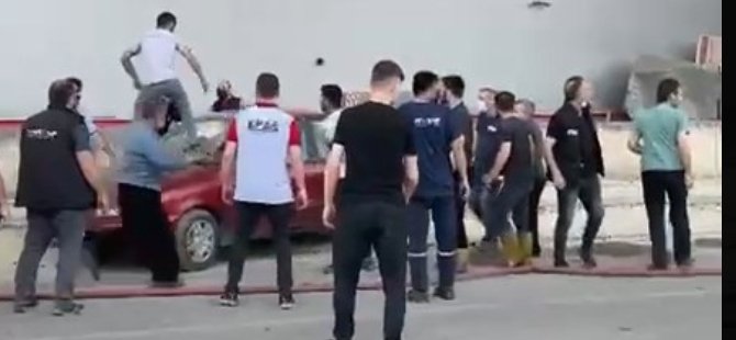 Bursa'da ısı yalıtım fabrikasındaki yangını söndürme çalışmaları sırasında ilginç görüntüler ortaya çıktı. Fabrikaya çok yakın bir noktada bulunan otomobilin sahibi bulunamayınca vatandaşlar otomobilin camını kırdı.