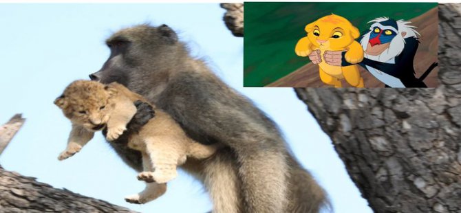 Güney Afrika’da gerçekleşen olayda bir babunun bir aslan yavrusunu kurtarıp ağaca çıkarması ünlü Disney filmi Alsan Kral’daki Rafiki ile Simba arasında ilişkiyi akıllara getirdi.