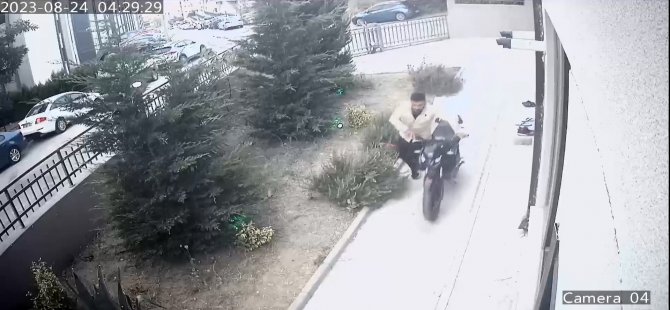 Hırsızlardan biri çevreyi gözetlerken diğeri ise bahçeye girip motosikleti sürükleyerek dışarı çıkardı. Hırsızlar daha sonra çaldıkları motosikleti çalıştırarak uzaklaştı.