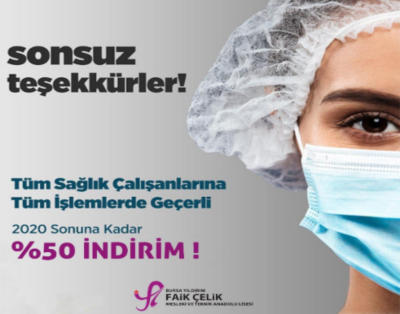 Faik Çelik Kız Mesleki ve Teknik Anadolu Lisesi, Koronavirüs salgını ile mücadele eden sağlık çalışanlarını unutmadı. Sağlık çalışanlarına, okulun güzellik merkezinde yüzde 50 indirim uygulama kararı aldı.