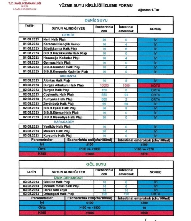 Bursa'da Mudanya, Karacabey ve Gemlik ilçelerinin Marmara Denizi’ne olan kıyıları ile İznik Gölü kıyısındaki plaj ve kamplarda yapılan Ağustos ayı birinci tur ölçümlerinde 24 plajın sonuçları açıklandı.