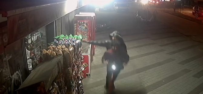 Bursa'nın İnegöl ilçesinde scoterlı gençlerin market önündeki raftan cips çalma anı kameraya yansıdı.
