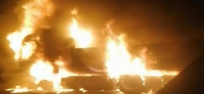 O sırada tır alev alev yanmaya başladı. Olay yerine gelen itfaiye ekipleri alevlere müdahale ederek kısa sürede söndürdü. Yangın sonucu araç kullanılmaz hale geldi.