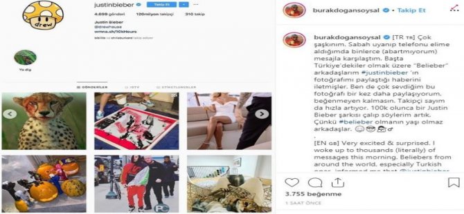 Dünyaca ünlü şarkıcı Justin Bieber'in sosyal medya hesabından yaptığı paylaşım Türkler'i sevindirdi. Bieber, 120 milyon takipçiye sahip olduğu Instagram’da, Bursalı doğa fotoğrafçısı, gezgin ve kuş gözlemcisi Burak Doğansoysal’a ait bir fotoğraf paylaştı.