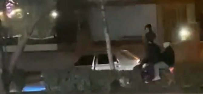 Motosikletle gelen 2 şahıs, aracı motosikletle itmeye başladı. Şahıslardan biri ise aracın bagajının üzerinde seyretti.