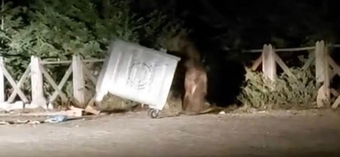 Uludağ'da aç kalan ayı çöp konteynerinde yemek ararken görüntülendi. Yerleşim bölgesine inen ayı konteyneri devirdi.